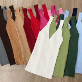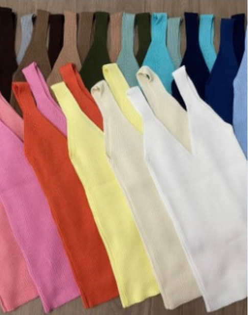 Regata básica em tricô. Disponível Azul claro, azul jeans, Azul, off, amarelo, dourado, branca, vermelha, verde, rosa e preta. R$90,00 -