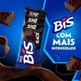 O Bis Black é uma versão especial do clássico Bis, trazendo um sabor mais intenso de chocolate meio amargo e um wafer escuro, que provavelmente contém cacau na massa. Ele é ideal para quem gosta de um toque menos doce e mais sofisticado no chocolate. O preço original era: R$13,50.R$10,99O preço atual é: R$10,99. -